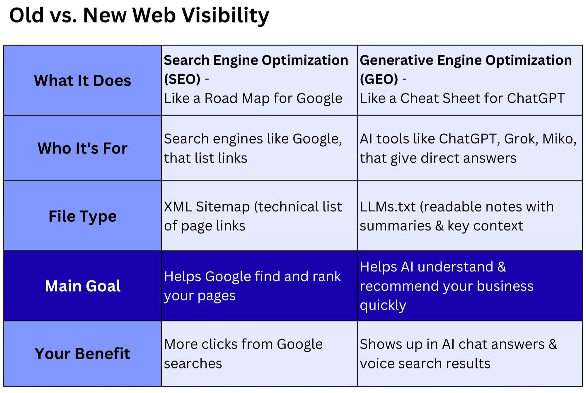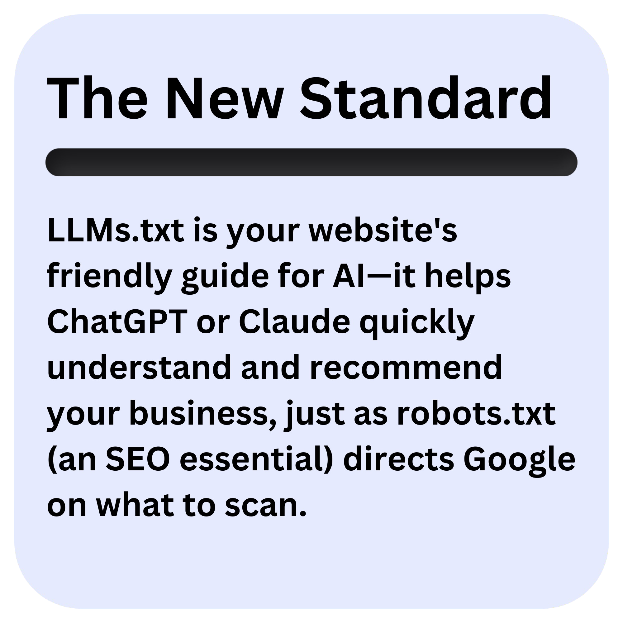 Robots.txt and sitemaps get you found by Google. LLMs.txt helps ChatGPT understand and recommend your business. Both win—but AI readability is your new edge. The two work together, but AI readability is becoming a new advantage on top of traditional search.